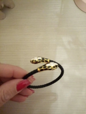 Wrap your wrist in power and style with this Double Snake Head Leather Bracelet. Crafted from high-quality leather, this bracelet features two intricately designed enamel snake heads that meet at the center, symbolizing strength, renewal, and unity. Available in multiple colors, this sleek and versatile piece is perfect for adding a touch of edge to your everyday look. The adjustable fit ensures comfort, making it ideal for any wrist size. Features: Material: Genuine leather with enamel snake head detailing Design: Double snake head motif – sleek and symbolic Adjustable Fit: Designed for comfort and style Colors: Multiple options to match your look .Whether worn solo or layered, this bracelet is a timeless statement piece that blends bold design with subtle elegance..